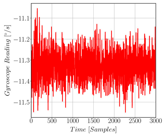 Raw Gyroscope reading while kept stationary. This represents the DC offset in the gyroscope reading. These data are processed to get the noise value for the gyroscope. R is Gyroscope reading in [°/s].
