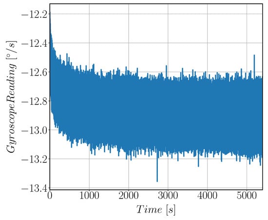 Raw sensor output signal in [°/s] at zero rate input velocity. The signal is acquired for 1.5 h and was used for Allan Variance calculations.