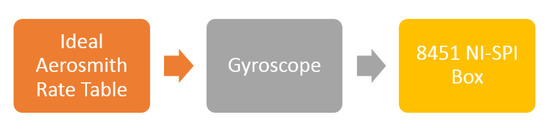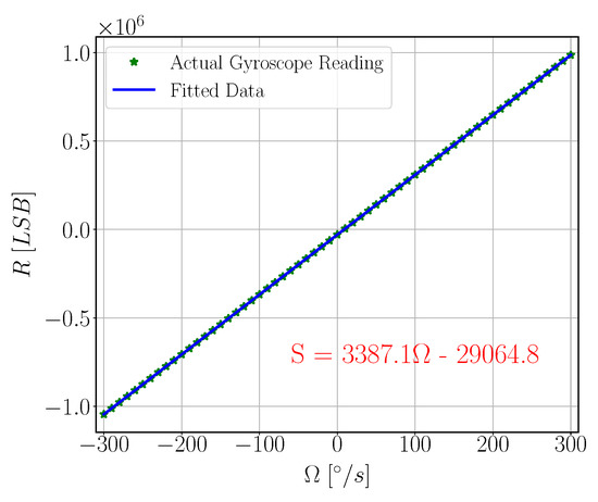 In order to measure SFNL, the rate table was used to apply angular velocity input from −300 °/s to 300 °/s with step of 10 °/s. Gyroscope reading was acquired using 8451 NI-SPI Box. Figure 22 shows SFNL testing setup components. At each velocity step, 1200 samples of sensor output data and simultaneous rate table velocity are acquired then averaged. Using least square method, linear relation between rate table velocity and the gyroscope reading is calculated Figure 23.
