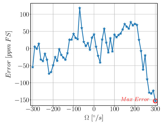 Measured velocity Error vs. Input Velocity. is Angular Velocity input from the rate table in °/s, Error is error between the actual gyroscope reading and the corresponding theoretical output from linear relation calculated in part per million linearized with respect to full scale range [ppm FS].