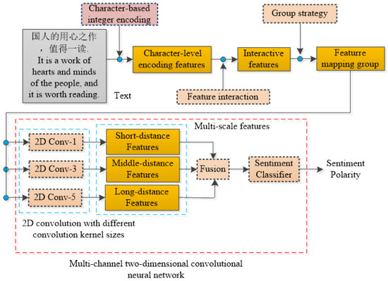 Based on the challenges of the above methods, and inspired by the great success of two-dimensional convolution in the image field and the multichannel network, we propose a multichannel two-dimensional convolutional neural network based on interactive features and group strategy (MCNN-IFGS) for Chinese sentiment analysis tasks. Specifically, our model is mainly composed of character-based integer encoding, interactive features, input tensor expansion based on group strategy, and multichannel two-dimensional convolutional neural networks with different convolution kernel sizes. The experimental results on the Chinese review dataset show that our method is effective. The main contributions of this paper are summarized as follows: