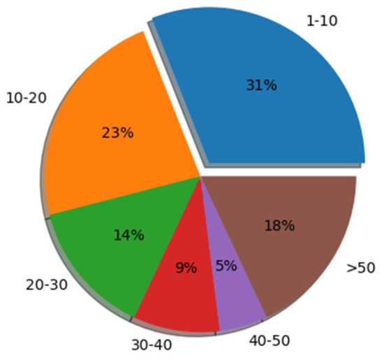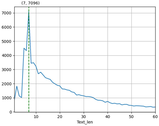 The experiment was carried out on a dataset of Chinese reviews from popular shopping websites in China [52]. The dataset included 100,000 shopping reviews, and each review corresponded to different sentiment polarity, positive or negative. In this paper, in order to maintain category balance, we randomly selected 97,200 reviews from the dataset, and used the standard train/test splits of 72,900/24,300 for the sentiment analysis task. The statistics of the dataset are shown in Table 1. In order to obtain more text information of the dataset, the text sequence length distribution of the dataset was counted as shown in Table 2, and the changes in the number of samples corresponding to different text lengths are shown in Figure 3. Figure 4 shows the probability distribution corresponding to different text length ranges.