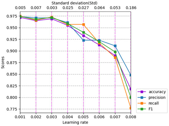 From the perspective of model stability, the stability of model performance was the worst when the learning rate was 0.008, and the average of the standard deviation of all evaluation metric scores was 0.186. In contrast, the stability of the model’s performance was the best when the learning rate was 0.003, and the average of the standard deviation of all evaluation metric scores was 0.003. From the overall trend of change, the average of the standard deviation of all evaluation metric scores increased with the increase of learning rate, which indicates that the stability of the model performance decreased with the increase of learning rate, and this instability would also affect the ability of the model to extract and utilize sentiment features. In any case, we can also see from Figure 5 that when the learning rate was in the range of 0.001 to 0.003, the stability of the model had a trend of first rise and then decline; the average of the standard deviation increased from 0.005 to 0007 and then decreased to 0.003, but the maximum volatility was only 0.007 and the average of the standard deviation was only 0.007, far lower than the value of the rest of the interval. This shows that although there were fluctuations in this interval, the stability of the model had little effect, and the stability of the model was relatively good. As the learning rate exceeded 0.003, this fluctuation disappeared, accompanied by a stable upward trend, indicating that the stability of the model changed significantly when the learning rate exceeded 0.003, and the unstable factors increased, which is not conducive to the model fully learning sentiment features.