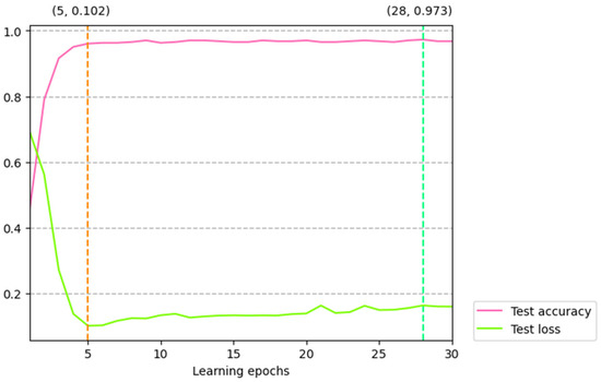 The test accuracy and test loss value change with the learning epochs. The value at the top of the spring green dashed line represents the learning epoch with the maximum test accuracy and its corresponding accuracy, and the value at the top of the lawn green dashed line represents the learning epoch with the minimum test loss and its corresponding test loss value.