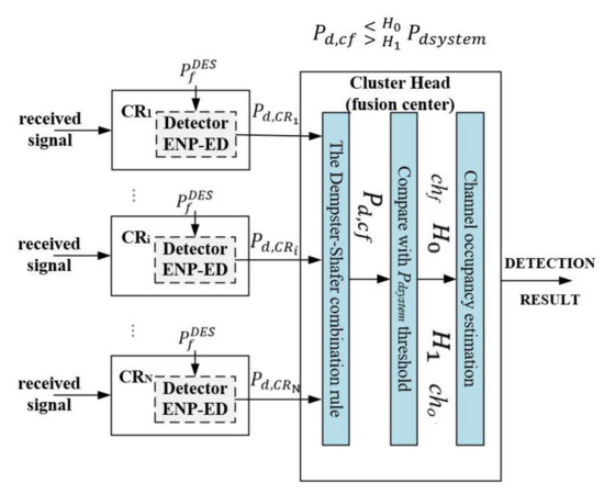 After the detection process, the local sensing results and the decisions with corresponding probabilities values ( and ) are transmitted to the data fusion center located in the CH in the proposed cooperative sensing solution (Figure 2). At the CH containing the fusion center, the final decision is made by comparing cooperative detection probability (fusion result ) with . detection probability threshold is set by the adopted policy of radio network operation (system administrator or supervisory unit), for which a decision on radio resource occupancy is made. In other words, each CR node provides different probabilities of signal detection . The CH takes a final decision whether the signal is present on the observed band or not. Based on the sensing information provided as an output: hard decision and soft decision algorithms may be used [26,27]: