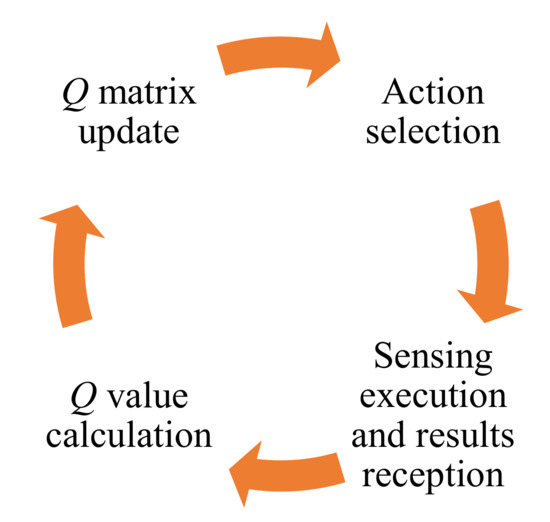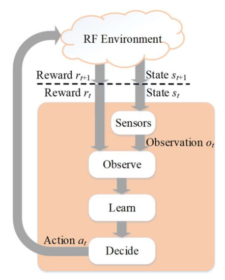 The central concept of this algorithm is based on the reinforcement learning cycle (Figure 3) [19]. When interacting with the environment, the learning entity makes specific actions that cause changes in the environment state and appropriate rewards. At the beginning of each cycle, the learning agent receives a full or partial observation of the current state and a reward. The next step is to learn by updating the operation policy, i.e., which actions result in the best rewards in a particular state. Finally, at the decision stage, the agent chooses an action in accordance with the modified policy. Reinforcement learning is one of the three basic types of machine learning. The other two types are supervised and unsupervised learning [31,32]. Some papers classified reinforcement learning as a subset of unsupervised learning methods [33]. Reinforcement learning methods are most suitable for spectrum monitoring and access tasks, especially in dynamically changing environments.