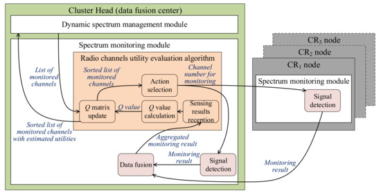 The integration of the proposed solutions is presented in Figure 5. The authors propose to combine cooperative spectrum monitoring with data fusion based on Dempster–Shafer theory and the radio channels utility evaluation algorithm based on the machine learning method.
