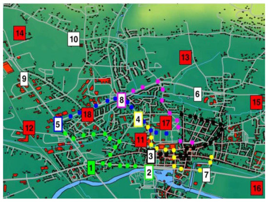 For all tests, authors consider a homogeneous network containing 10 CR nodes with 1 Cluster Head (CR node1—green color) and 8 Non-cooperative Nodes (NcN), representing interfering signals from primary users, legacy waveforms, or intentional jammers. Geolocation for the node’s area is presented in Figure 6. NcNs are stationary, and CRs are mobile with 5 m/s speed. Therefore, the localization area is limited to 10 km × 10 km square in the urban/suburban area. In addition, each of the CR has an ED-ENP detector with the Neyman–Pearson criterion for constant false alarm value.
