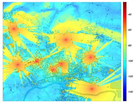For the path loss calculation, REMO [40] module is used. It contains combined propagation models that fit specific frequency bands, communications ranges, and terrain conditions. Apart from that, REMO simulates the non-ideal properties of radio transmitters and receivers. It also enables the generation of interferences coming from NcNs. An example of calculated NcN signals power in the urban area is presented in Figure 7.