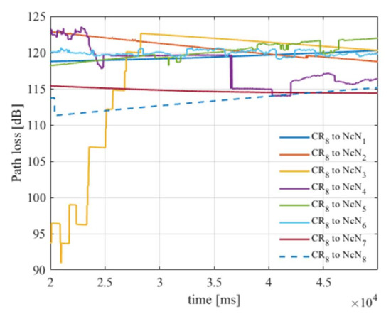 As an example, in Figure 8, path loss for CR node number 8 and all NcNs is presented.