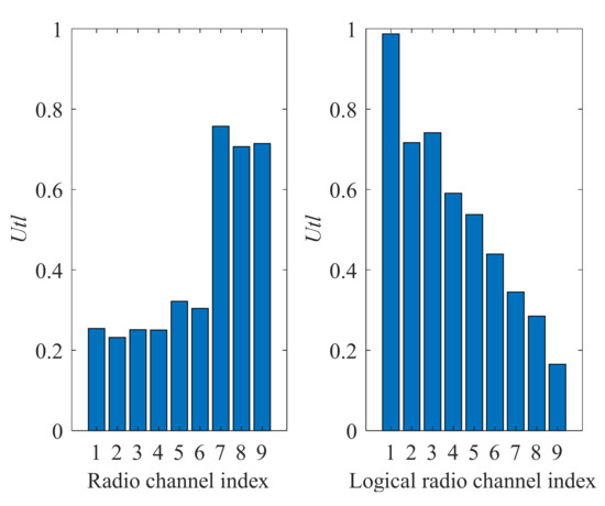Utility ratio (Utl) values for physical radio channels (on the left) and logical radio channels selected by the proposed algorithm (on the right).
