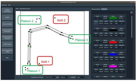To verify and evaluate the proper operation of the proposed solution in the Cognitive Radio Network (MAENA Simulator), scenario 2 was prepared (Figure 15). This is the situation for three platoons. Each platoon contains three radio nodes—two Communication Nodes and one Cluster Head. Platoon 1 and Platoon 2 are static, while Platoon 3 is mobile. The path for the Platoon 3 movement is presented in Figure 15. All radio nodes use the basic UHF waveform based on CORASMA waveform [41], enabling the creation of self-organizing radio networks, grouping nodes into clusters, the election of cluster heads (managing the nodes belonging to the cluster), and gateways responsible for inter-cluster communications. Next, cluster graph coloring is performed to use the assigned spectral resources efficiently. Compared to the CORASMA waveform, the reference waveform has several additional features: frequency hopping, management of retransmissions, and optimized routing procedures. This reference waveform is extended with additional functions by solutions proposed in this article. Scenario 2 is run with different policies/strategies for Sensing, Data Fusion, and the radio channels utility evaluation algorithm to obtain different network behavior, according to the mission goals and existing restrictions. The defined policies should enable, e.g., maximization of waveform data rate available for the users, or battery life extension, minimization of transmission detection probability, or increased immunity to interference in a variable spectral situation.