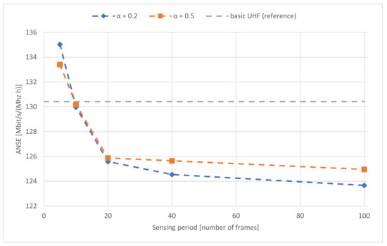 results for scenario 2 are presented in Figure 16. Tests were performed for different parameters values: learning rate α (0.2 and 0.5) and sensing period (time between successive detection scaled in frames). As a reference, results for the basic UHF waveform are also shown.