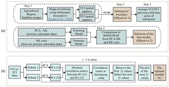 The proposed four-step framework for enhancing crop yield predictions based on VCI/TCI indices, sICA, and PCA coupled with ML methods is summarized in Figure 1a and described in this section.