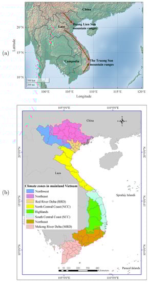 (a) The Hoang Lien Son mountain and the Truong Son mountain ranges in Vietnam; (b) eight climate zones in mainland Vietnam: Northwest, Northeast, RRD, NCC, SCC, Highlands, Southeast, and MRD.