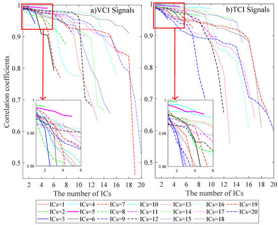 The ICA-by-Blocks model (cf. step 2 in Section 2) is applied separately for the VCI and TCI datasets. The correlation between the of the two subsets (p-value < 0.05) is presented in Figure 3a,b for VCI and TCI, respectively. It can be seen that the correlations are close to 1 for ranging from 1 to 5 for both VCI and TCI signals. After 5 , the correlation reduces progressively when the number of increases to 6 or 7 and up to 20 . The maximum investigated number of 20 is significant enough because when adding more than 5 , all the correlations between the of the two subsets are much lower. The optimal number of for VCI and TCI is thus set to five in this study.