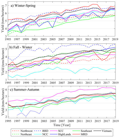 In Vietnam, the rice-growing seasons are categorized into the Winter–Spring, Fall–Winter, and Summer–Autumn seasons. The seasonal rice yields (averages over all of the provinces) from 1995 to 2019 are collected from the General Statistics Office of Vietnam via the link: https://www.gso.gov.vn/Default20en.aspx?tabid=491, accessed on 15 January 2021.