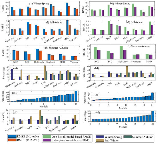 Figure 6(a1–a5) show the upgrade of the PCA-ML-based rice forecasting models compared with the ML-only-based ones. Figure 6(a1–a3) display the tested RMSE of the PCA-ML/ML-only-based models for Winter-Spring, Fall-Winter, and Summer-Autumn, respectively. Figure 6(a4) expresses the improvement by the PCA-ML models are in the subregional groups. In contrast, Figure 6(a5) sorts this information from the lowest value to highest value. Figure 6(a4) shows that for the Northwest, Northeast, and RRD, the left and right columns represent Winter–Spring and Fall–Winter, respectively; the left, middle, and right columns are for Winter–Spring, Fall–Winter, and Summer–Autumn, respectively, for the remaining areas.