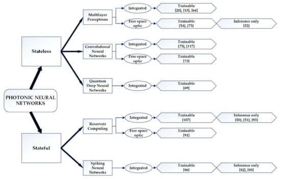 Moreover, the PNNs are classified according to design (integrated or free-space optic) and according to optical training ability (trainable) or reference only (inference). The types of networks that have been applied in modern neuromorphic technology and their respective modifications are thoroughly explained below [,].