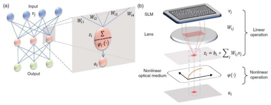 (a) A neural network with two layers and a detailed view of one of its neurons. (b) Implementation of an optical neuron with linear operation (SLM and lens units) and non-linear operation (activation function φ) [].