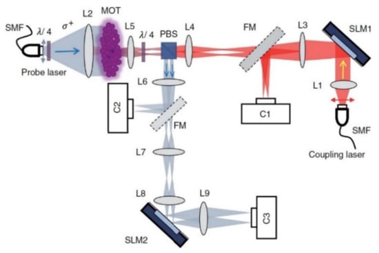The non-linear operation is accomplished through electromagnetically induced transparency (EIT), which is based on quantum phenomena and is produced by laser-cooled atoms 85Rb, in a magneto-optical trap (MOT) [,]. The materialization of this particular architecture is shown in Figure 3 [,,,,]: