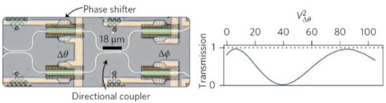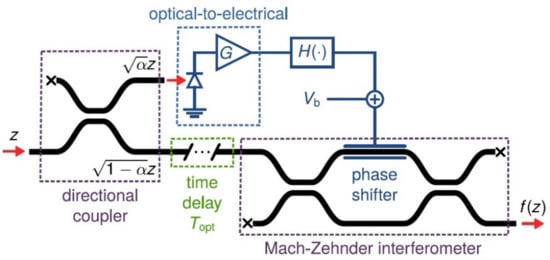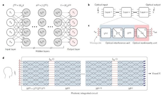 - Shen, Y.; Harris, N.C.; Skirlo, S.; Prabhu, M.; Baehr-Jones, T.; Hochberg, M.; Sun, X.; Zhao, S.; LaRochelle, H.; Englund, D.; et al. Deep learning with coherent nanophotonic circuits. Nat. Photon. 2017, 11, 441–446. [Google Scholar] [CrossRef]