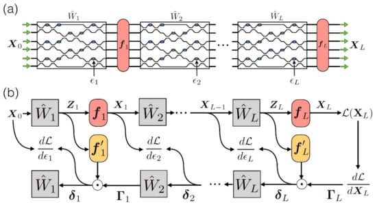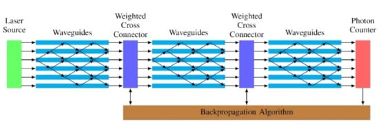 Deep neural networks (DNNs) are used in solving complex problems of high complexity like medical image analysis, speech recognition, language translation, image classification and many more []. However, as the number of layers increases, its structure becomes more complex and this result in the input of a great computational load on the processor. Consequently, the training time increases and so does the energy consumption. These restrictions created the need for the materialization of PΝNs of many layers (deep photonic neural networks—DPNNs), since the advantages of photonic transmission speed and the minimum energy consumption are indisputable [,,].