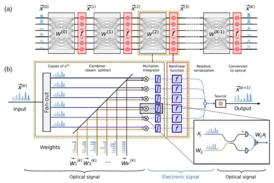 (a) Schematic diagram ΝN of K-layers consisting of a multiplier (grey) and an element for the activation function (red). (b) The multiplication performs a combination of inputs with the weight signals using homodyning [].