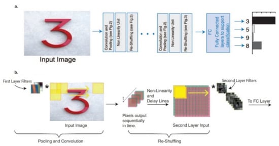 Another suggestion of a CNN with full use of optical convolutional neural networks (OCNN) is presented in Figure 9 [,,,,].