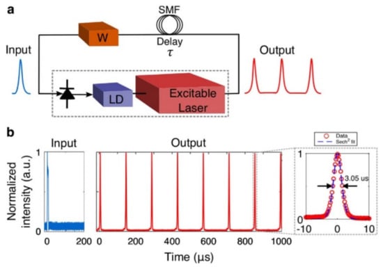 (a) The circuit for the creation of repeated current peak. (b) The waveforms of the implementation. One pulse of the output is led to the input via single-mode fiber (SMF), which acts as a delay element [].