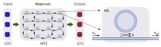 - Vandoorne, K.; Mechet, P.; Van Vaerenbergh, T.; Fiers, M.; Morthier, G.; Verstraeten, D.; Schrauwen, B.; Dambre, J.; Bienstman, P. Experimental demonstration of reservoir computing on a silicon photonics chip. Nat. Commun. 2014, 5, 3541. [Google Scholar] [CrossRef]