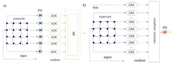 Optical applications with photonic reservoir computing (PRC) architecture are presented in several research projects. In one of them, as shown in Figure 11, passive optical elements are used for the materialization of the reservoir, which consists of a 4 × 4 = 16 node system with splitters, couplers and waveguides, creating in this way a complex interferometer that operates in a random way. The fact that it comprises only passive elements renders it perfect from an energy efficiency point of view, but it displays solely a linear behavior. This can be offset in the readout layer with the introduction of a photodiode as a non-linear element [,,,].