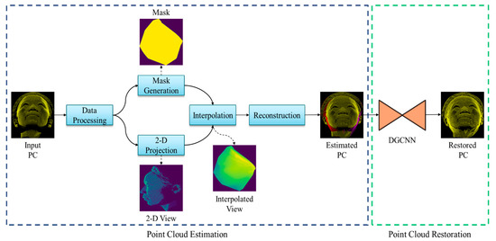 A block diagram of the proposed system is depicted in Figure 2. The overall architecture consists of two major parts: (1) point cloud estimation and (2) point cloud restoration. The input point cloud (front view) is passed through the estimation module, which performs several operations to fill out the incomplete regions. The estimated points (front view with left and right estimation) were then restored using a deep learning model. The details of point cloud estimation and restoration are illustrated below.