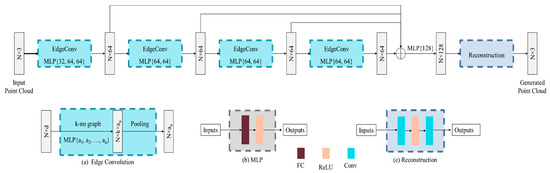 Each MLP layer consists of one fully connected and one rectified linear unit (ReLU) layer. The fully connected layer learns the non-linear combination of features. The ReLU is used to consider only the positive response. After the MLP operations, we apply a pooling layer among the adjacent features to generate an dimensional feature from an dimensional feature as shown in Figure 3a. Here, , and indicate the number of input points, the number of neighboring points and the number of MLP layers, respectively. We have fixed the value of k as described in [9]. Each EdgeConv layer generates dimensional features which are then concatenated and passed a features map through a MLP layer again. The MLP layer reduces the size of features map from to . We additionally integrate a reconstruction layer that conducts convolution, ReLU and convolution operations to generate the final point clouds. The first convolution operation generates to dimensional features and passes through a ReLU operation. Finally, the second convolution produces the final outputs of shape .