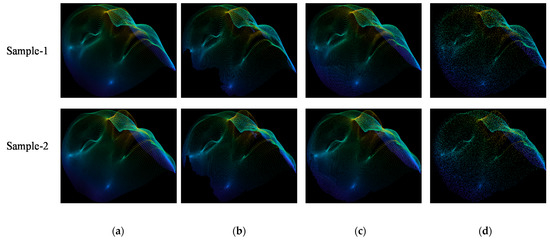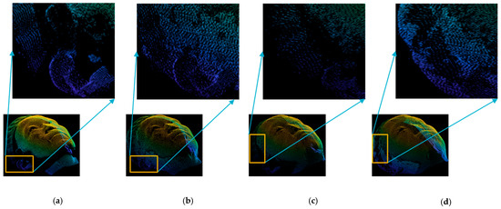 To provide better comparisons, we visualized the restored point clouds obtained by PU-Net, PU-GAN, DRMD and DGCNN in the LSFM dataset as shown in Figure 10. The restored point cloud using PU-Net and DRMD are much worse as shown in Figure 10b,d. However, PU-GAN and proposed DGCNN can effectively restored the estimated points as shown in Figure 10c,e.
