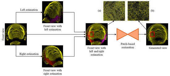 An example of the overall process is shown in Figure 6, in which the front view input point cloud is passed through the left and right estimation modules to fill the incomplete regions on the left and right sides indicated by purple and red colors. The front view, left estimation and right estimation are then combined to generate an estimated point cloud with filled incomplete regions. A restoration model is then integrated to restore the estimated point cloud to make them resemble the ground truth point cloud. To compare the visual results, we added two patches from the estimated and restored point clouds, as given in Figure 6a,b.