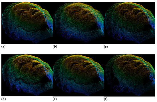 For better understanding and comparison, we also applied the restoration with our proposed DGCNN and compared it with PU-Net, PU-GAN and DRMD methods. Figure 8a–f depict the estimated, restored with PU-Net, PU-GAN, DRMD, DGCNN and ground truth point clouds, respectively. From Figure 8, it can be noticed that the visual result of the proposed DGCNN is much better than the results obtained by estimation, PU-Net, PU-GAN and DRMD, respectively. In Figure 8b, we can also notice that the restored points obtained by PU-Net and DRMD are too noisy and completely misaligned compared to estimated and ground truth point clouds. PU-GAN can restore the estimated point which is better than PU-Net and DRMD but less than the proposed DGCNN model. Therefore, we can emphasize that the proposed DGCNN can effectively restore the estimated point cloud of our own dataset than the prior point cloud processing techniques.