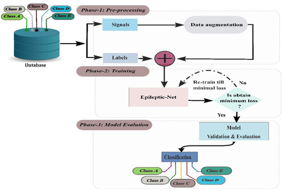 The block diagram in Figure 2 describes the methodological steps involved with our proposed method to detect the ES. It is divided into three major parts: (i) Input part, which takes an EEG signal, splits it into sub-signals using fixed-size overlapping windows, (ii) training parts, where the preprocessed data has been fed into the proposed model (Epileptic-Net) to train until the minimum loss is obtained, and (iii) evaluate the model to classify/detect ES.