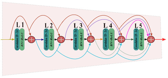 The dense convolutional block (DCB) consists of convolution layers, batch normalization (BN) layers, and rectified linear units (ReLU) activation functions. After every convolution operation, batch normalization (BN) and ReLU are added. Each layer’s input is a superposition of all the previous layer’s outputs. Each layer’s output is used as the input for all subsequent layers latterly. The features produced by all convolutional layers are connected with dense connections to fuse the multilayer features. These dense connection helps to utilize all feature data of every layer to get specific semantic features. The layer can be received in Equation (1). A schematic diagram of the DCB is shown in Figure 4.