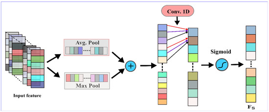 Figure 5 shows the kernel feature map is squeezed by utilizing average pooling and max pooling over every 3 × 1 small region. Then, a convolution operation was performed using a single convolution kernel with a filter of size 3 × 1. Lastly, in order to obtain a feature map, a sigmoid activation function is applied to the convolutional operation. The resultant features map is compatible with the input feature map in the spatial dimension. The mathematical expression of the FAM part is given as follows: