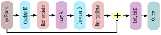 where f(x) is the layer’s output, x is the input, and R(x) is the output of the residual block. In this block, the residual component f(x) is defined as two consecutive copies of a trio of operations: convolution with a filter of size 3 × 1, batch normalization, and Leaky ReLU activation (LeakyReLU activation is not used in second copies). Then, the feature map from f(x) concatenates with input x. Finally, the LeakyReLU activation function is performed on concatenated features. The whole block of R(x) is referred to as a residual block (RB). The schematic diagram of the residual block is shown in Figure 6.
