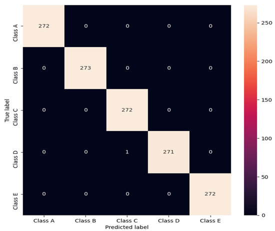 Figure 7 represents a confusion matrix of ES detection, computed over the 10 repetitions format by employing a 10-fold CV procedure. The proposed model predicted the normal and ictal class with 100% accuracy. Thus, the main confusion arises between preictal classes (C and D), with very similar signal patterns.