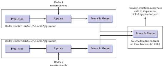 This manuscript deals with the application of the GM PHD algorithm in a distributed sensor network, which can be: Radars or cameras installed along the coast or area of interest; radars on patrol or larger ships; and sensors installed in smaller boats. In such a system, unlike those presented in other applications [14,15,16], each node has its processing and tracking solution. Furthermore, through a communication link, they send their tracking data to a central station responsible for gathering and processing the information obtained by the distributed components.
