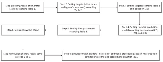 Figure 1 presents the implementation scheme for PHD filtering in local trackers and the data fusion in Central Station (C&C), for the case illustrated in this work. The simulations presented in this section use this same scheme.