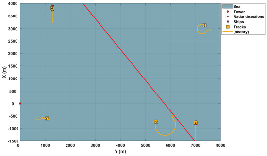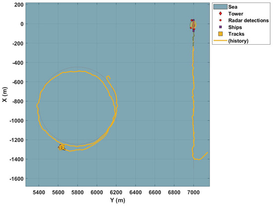 As stated before, these figures demonstrate the tracking system’s performance with just one sensor. In addition, these figures show that the ships are tracked regardless of whether the movement performed is linear or circular, despite an initial transitory. It is noteworthy that the vessels present significant differences in their speed and movements. At the same time, one navigates at 12 knots, the other spins at 30 knots.