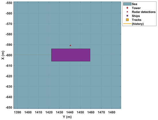 Due to confidentiality issues, only simulations based on Matlab Sensor Fusion® objects are used to illustrate the results of the application. In this simulation scenario, the distributed network is composed of two stationary sensors (2D radars). Both radars stare into the harbor, covering a 90-degree azimuth sector. The sensors are diagonally positioned in the surveillance area in opposite directions, according to Table 1. Each of them has a tracker responsible for monitoring targets in their respective FoV and providing the posterior intensity distribution.