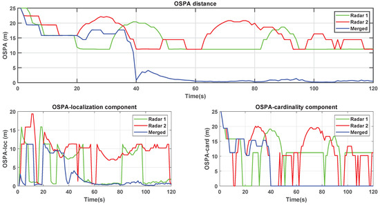 Finally, Figure 10 presents the OSPA metric and its components, which corroborates the analyses based on the previous figures. The merged tracker is faster and more stable, as can be observed in the plots, in particular after a period of 40 s. The lower the metric value, the better the filter’s performance. Furthermore, the combined filter with data from both radars shows better results for localization and cardinality OSPA components. The location component is related to the position error, as can be seen in Figure 10, after 40 s, the value tends to zero. Similarly, at the same instant, the cardinality component becomes zero.
