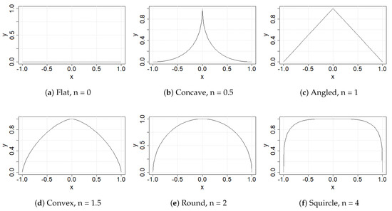 - Gardiner, M. The superellipse: A curve that lies between the ellipse and the rectangle. Sci. Am. 1965, 213, 222–232. [Google Scholar]