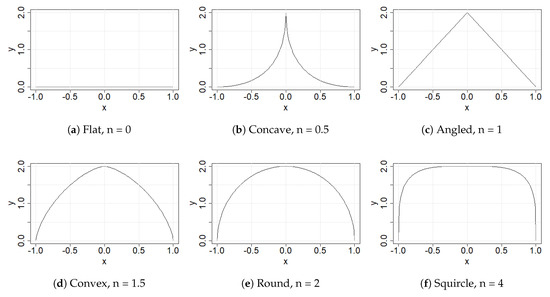Special cases of Equation (1) yield different shapes by modifying a small number of parameters (e.g., n), as shown below in Figure 1. Materials analysis can therefore be related to a small number of parameters. We had two shape groups, distinguished only by , see Figure 1, and , see Figure 2, which is an extruded version of the first shape group.