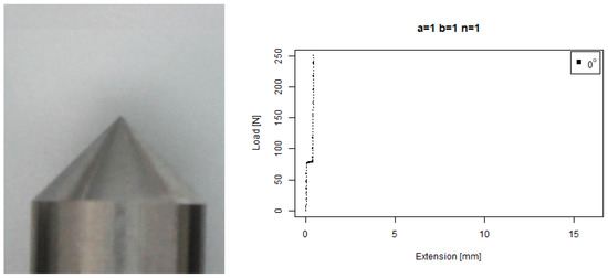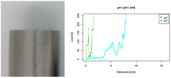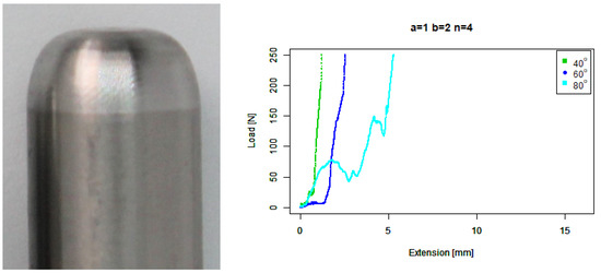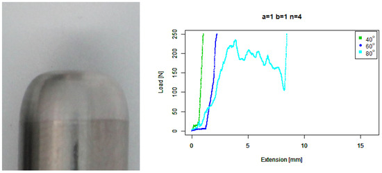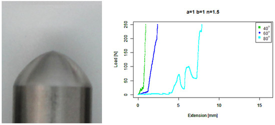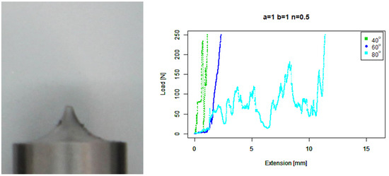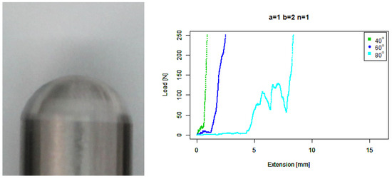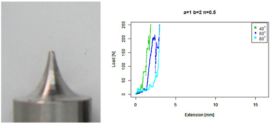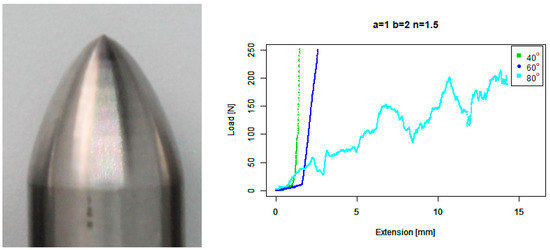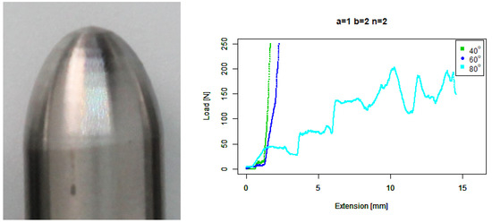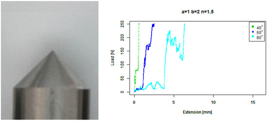 For our basic angle () tip, Figure 9 shows that it ramped up earlier than the flat tip on the 80 concrete, on a similar trajectory to the 60 response around a 2 mm extension; however, it then responded much more wildly than the flat tip and extended further. It also skidded against the 40 concrete at a higher force than the flat tip.